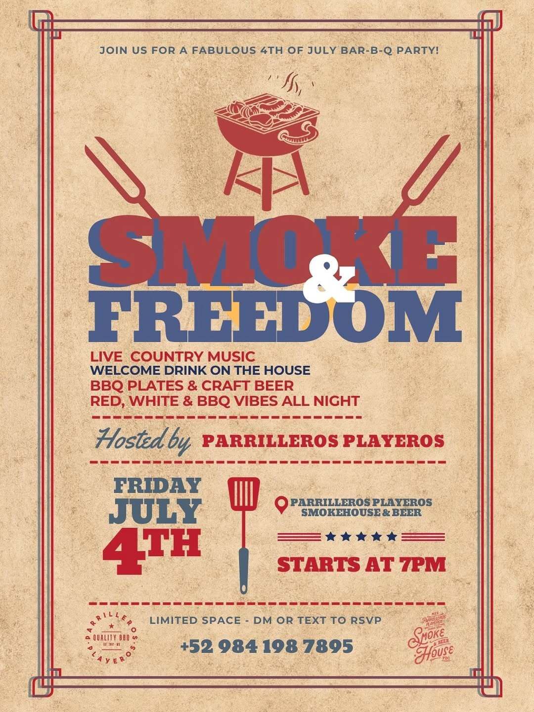 This Friday, July 4th, Parrilleros Playeros in Playa del Carmen is firing up the grill for a good old-fashioned Stars & Stripes celebration—Texas-style. Join the crew at Smokehouse & Beer for Smoke & Freedom, a backyard-style BBQ bash with bold flavors, craft brews, and red, white, and smoky vibes all night long.