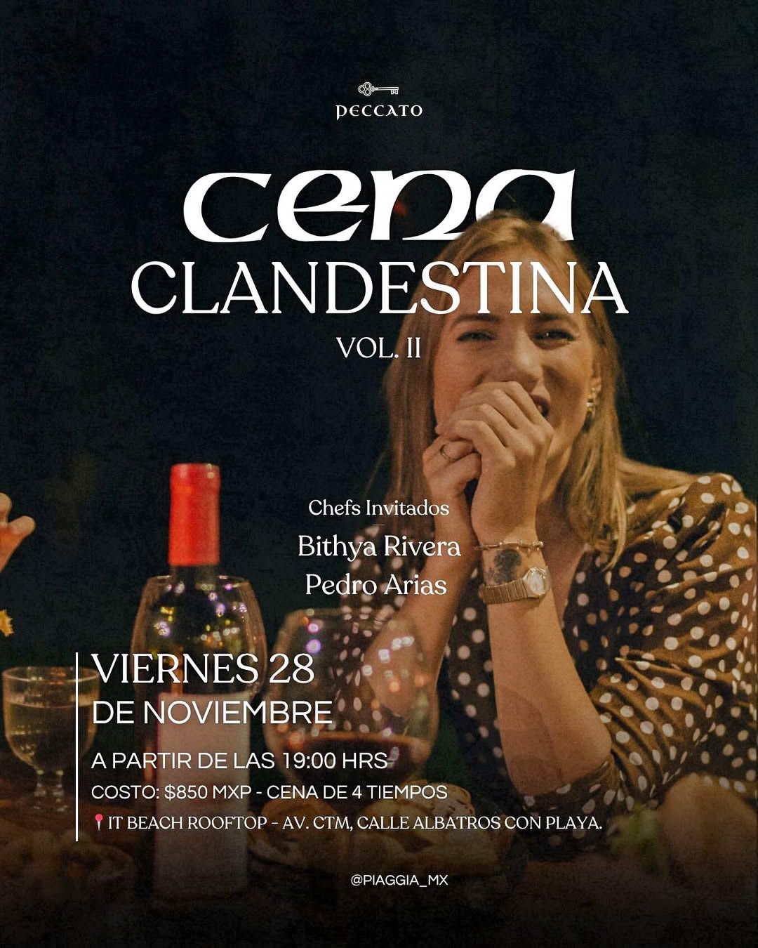 Cena Clandestina is priced at 850 MXN per person and begins at 7 PM on the IT Beach Rooftop. Reservations are essential, and spots tend to disappear quickly. Contact 984 179 8471 to reserve your spot.