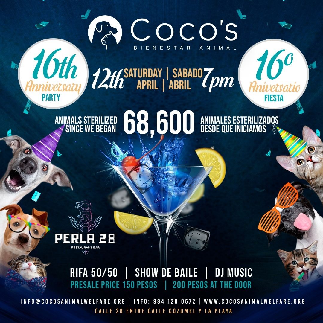 🎉 Happy 16th Anniversary, Coco’s Animal Welfare! Join the celebration as Coco’s marks 16 incredible years of compassion, care, and community impact! Come raise a glass at Perla 28 Restaurant-Bar on Saturday, April 12, starting at 7:00 PM.