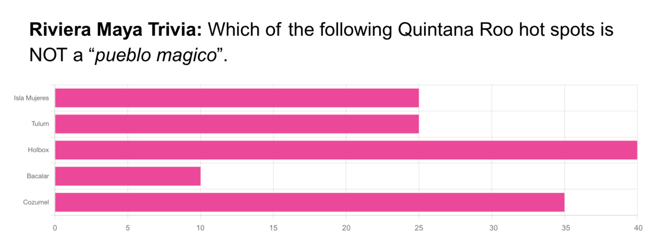 Last week we asked, which of the following Quintana Roo hot spots is NOT a “Pueblo Magico”. Isla Mujeres, Tulum, Bacalar, Holbox or Cozumel.